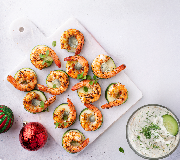 You won’t be able to stop at just one of these easy bites! Juicy pan-seared prawns sit on top of cool cucumber slices with a dollop of herby cream cheese.