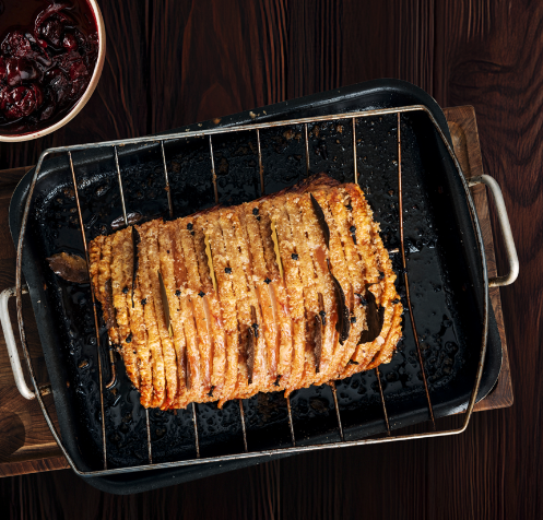 - Increase oven to 220°C. Roast a further 45–60 minutes, or until rind is golden and crackled. Rest for 20 minutes.