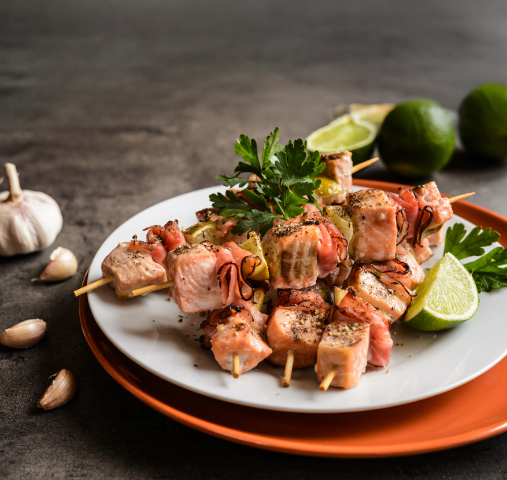 These elegant skewers combine tender salmon with delicate double smoked ham, grilled to perfection with caramelised edges and finished with