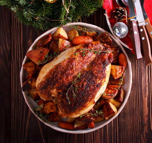 2½ hours. - Increase the oven temperature to 220°C (fan-forced 200°C). Remove the foil, brush with the reserved butter, and roast uncovered for a further 30–40 minutes until the skin is golden, juices run clear and the thickest part of the thigh reaches 70°C.