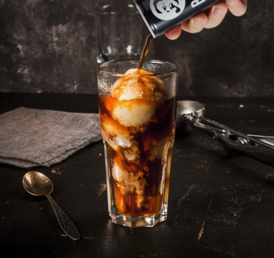 - Slowly our one can of chilled coffee over the ice cream in each glass.