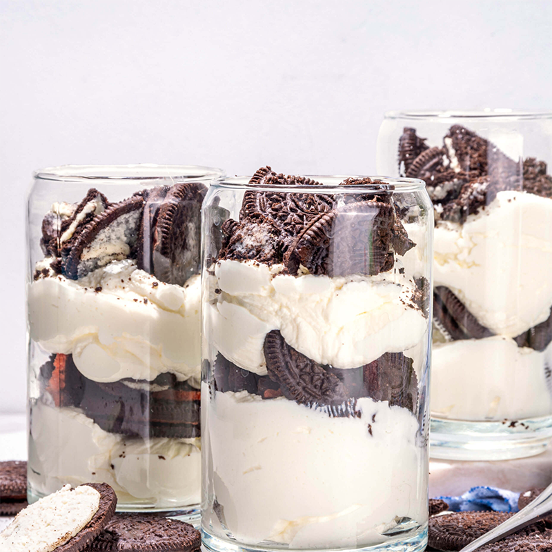 - Finish by garnishing each glass with one of the reserved whole Oreos. Serve immediately or refrigerate until ready to enjoy.