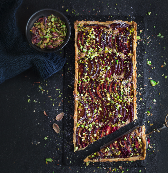 Squidgy plums and crunchy pistachios are a match made in heaven in this impressive tart.